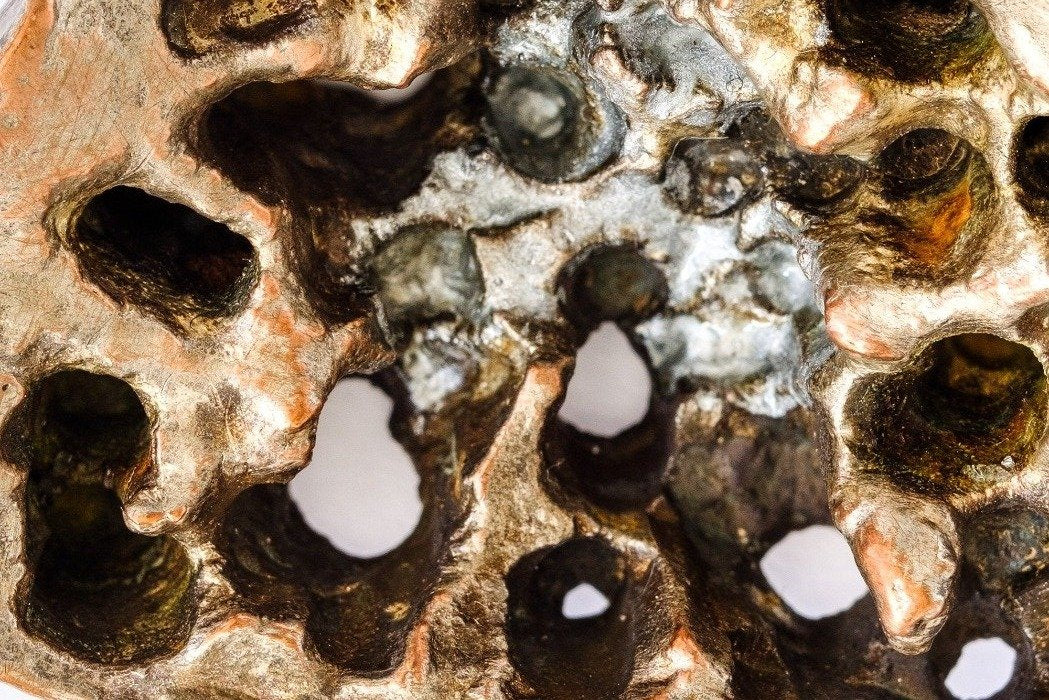 Print of a sculpture made from Kolanut, coated with copper, plated with silver and oxidised.