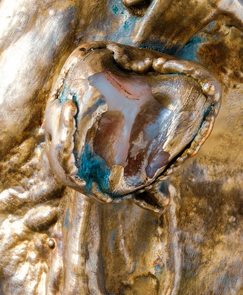 Framed print of a sculpture of a kolanut coated with copper and oxidised, with mother of pearl embedded within the kolanut.