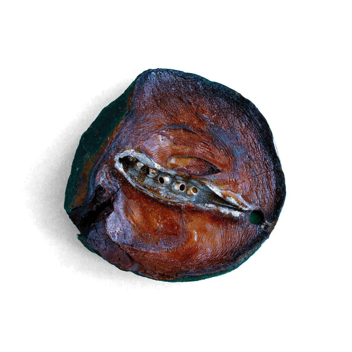 Framed print of a sculpture of natural Kolanut with sterling silver beads, painted with silver enamel paint.